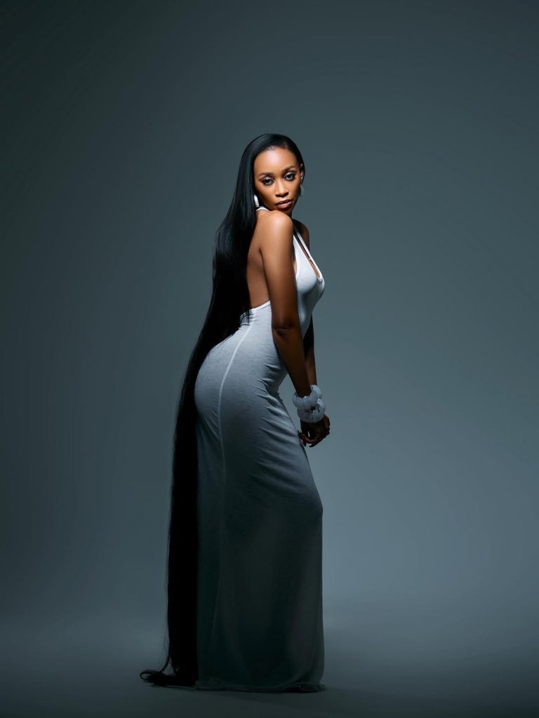 The soulful artist, celebrated for her elegant aesthetic, took to Instagram to share pictures that showcased her in a simple yet classy dress, which was dramatically complemented by an exceptionally long weave that cascaded all the way to the floor.