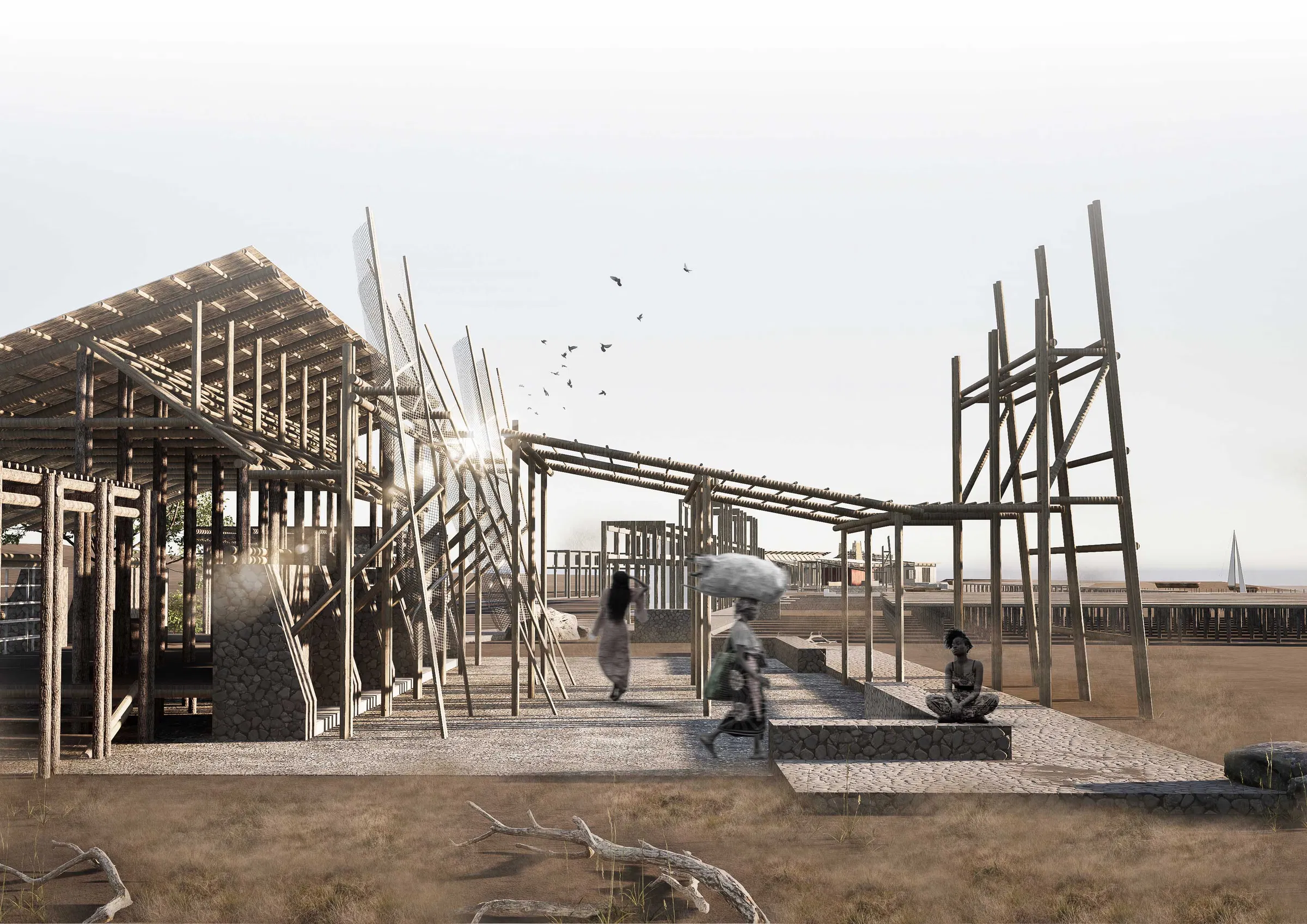 The Vision: The project merges a slave route memorial center with a functional beachside fishing village, creating a space that bridges the gap between painful history and contemporary communal life.